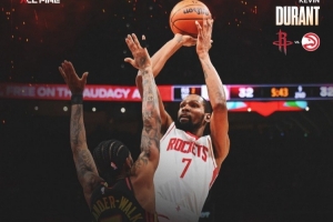 赛后,火箭官方晒出杜兰特的数据海报,并写道:“杜兰特再次拿出看家本领,砍下又一个30+。”