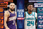 直播吧2月3日讯 今日NBA官方宣布,太阳球员狄龙·布鲁克斯和黄蜂球员布兰登·米勒,分别被评为本赛季第15周西部和东部周最佳球员。