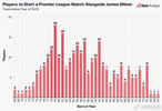据Opta统计,英超历史上有49%的球员与米尔纳同场竞技过,以队友或对手的身份。另外,米尔纳在英超与281位不同的队友并肩作战,这些队友出生的年份跨度从1968年至2007年。