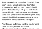 球队消息人士表示,湖人不会只走一条路。可以去追字母哥,可以去探索用选秀权交易来优质角色球员,可以去加大力度追求心仪的顶级受限制自由球员。