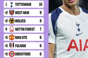 1、热刺 10场