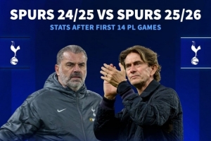 热刺上赛季、本赛季英超前14轮数据: