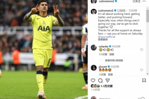 罗梅罗社媒晒出比赛照片,配文:“一切都关乎努力拼搏、不断进步、勇往直前。尤其在当下,当事态不如意时,我们更要团结一心🤍”