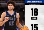 此役,2026年状元热门、杜克大学前锋卡梅隆·布泽尔继续有着优异表现,本场比赛他登场34分钟13投7中,三分3中1、罚球4中3,砍下18分15篮板5助攻2抢断1盖帽,得分全场最高,篮板全队第一。