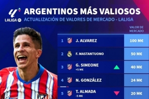 西甲阿根廷球员身价:小蜘蛛1亿欧最高,马斯坦托诺5000万欧次席