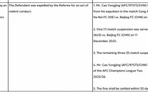 体育资讯12月15日讯 亚足联官方公布罚单,曹永竞亚冠二恶劣动作染红,禁赛4场罚款1500美元。