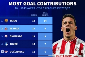 本赛季五大联赛U19参与进球榜:亚马尔14球居首,马拉、卡尔在列