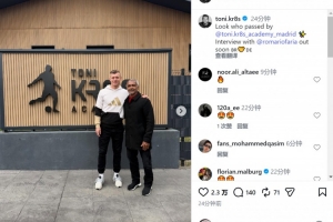 克罗斯社媒晒出合照,配文:“看看谁来青训学院了?与罗马里奥的专访即将发布。”