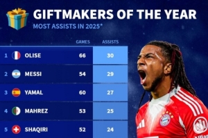 2025年度助攻榜:奥利塞66场30次居首,梅西54场29次第二
