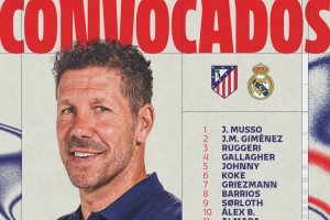 马竞西超杯对阵皇马名单:阿尔瓦雷斯、格列兹曼、科克领衔