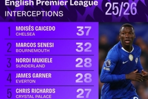 体育资讯1月10日讯 squawka统计了本赛季英超成功拦截情况,凯塞多力压塞内西居首。