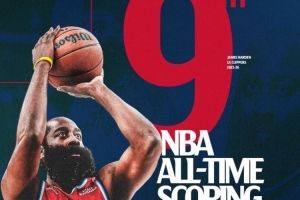 快船官推晒图,祝贺哈登得分超越奥尼尔升至历史第九。