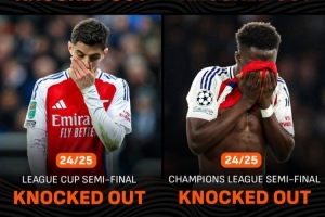 据Live Score统计,阿森纳各项赛事近4次半决赛皆出局,这是该俱乐部历史上最长的半决赛连续出局纪录。