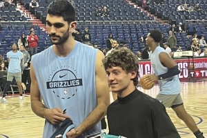 赛前,灰熊内线阿尔达马和梅奔F1车手安东内利两人交换了球衣。