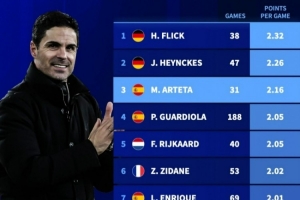 体育资讯1月21日讯 德转盘点了自92/93赛季欧冠改制以来,至少带队25场的主帅中场均积分榜,其中弗里克居首,具体如下: