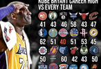 科比面对NBA其他29支球队的最高得分!最低的为40分,最高的为81分。科比面对17支球队拿到单场50+得分。#微博兴趣创作计划# #科比#